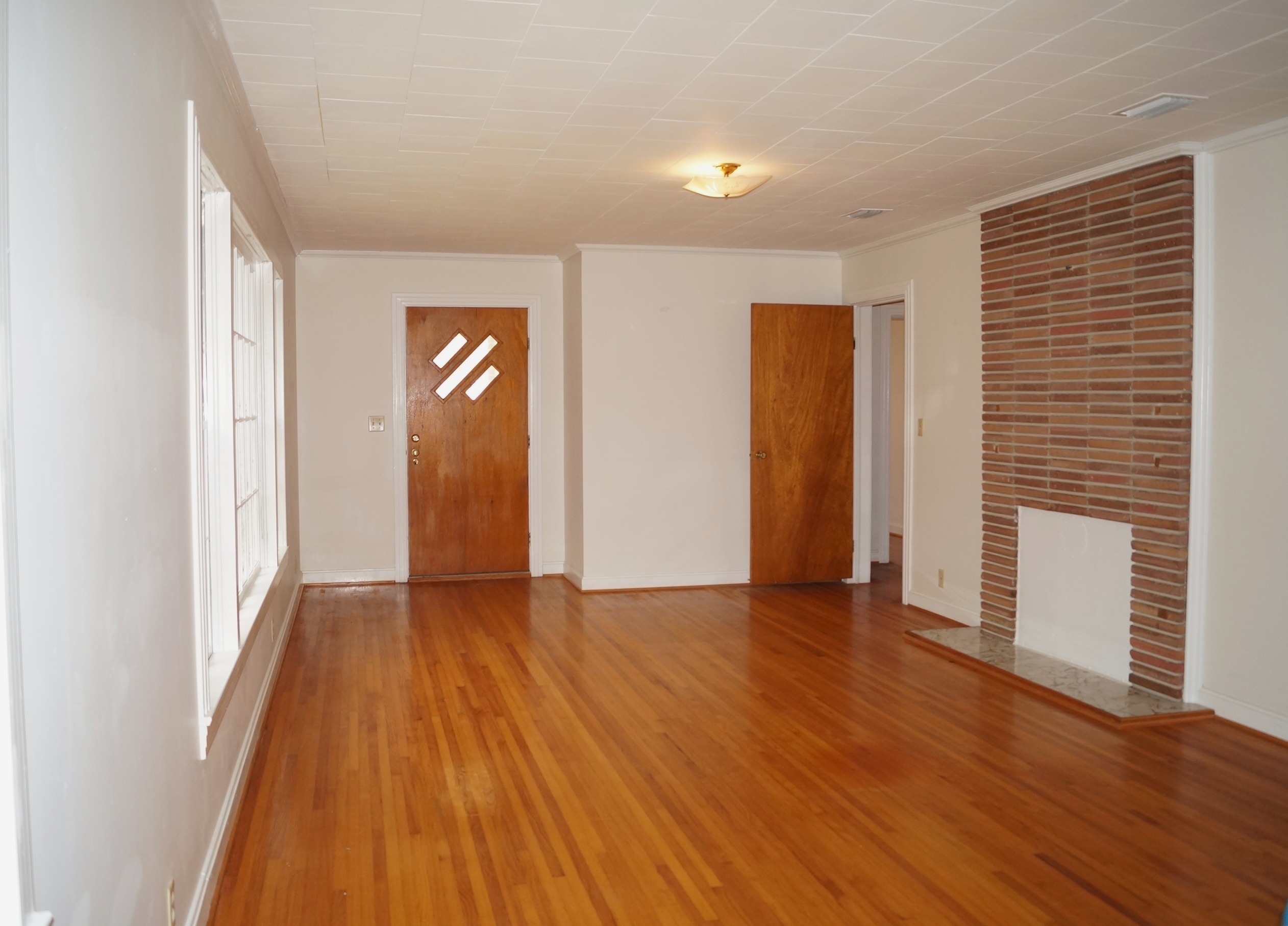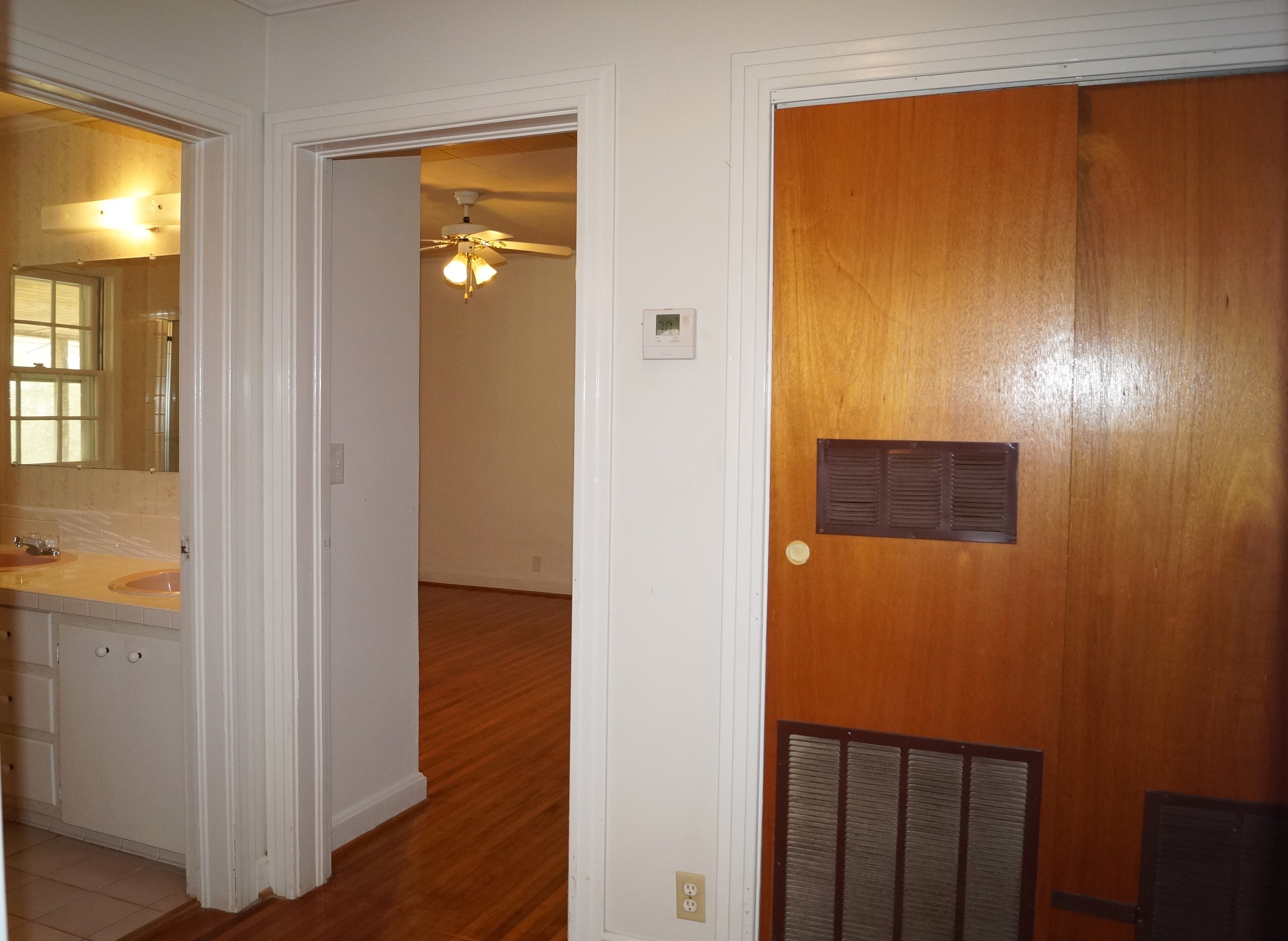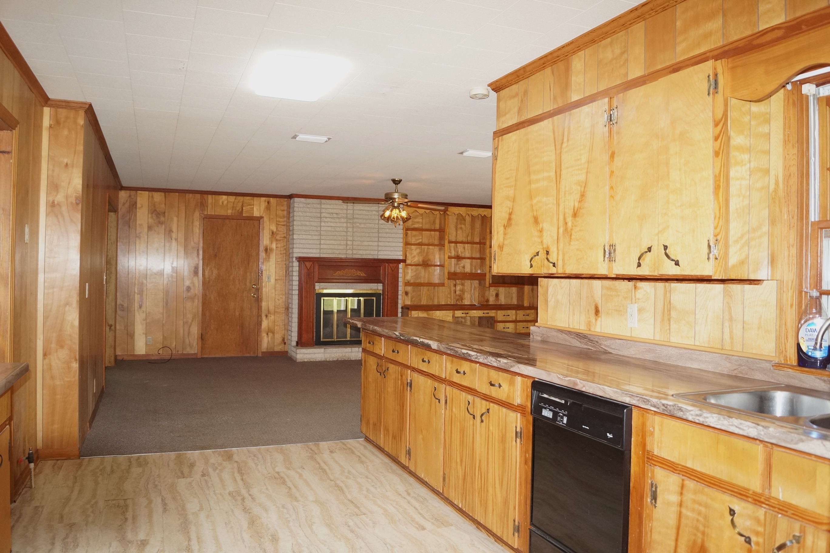 The kitchen offers a convenient walk-through layout with plenty of cabinet and countertop space—perfect for cooking and entertaining. The home includes three generously sized bedrooms and a large bathroom with double sinks.