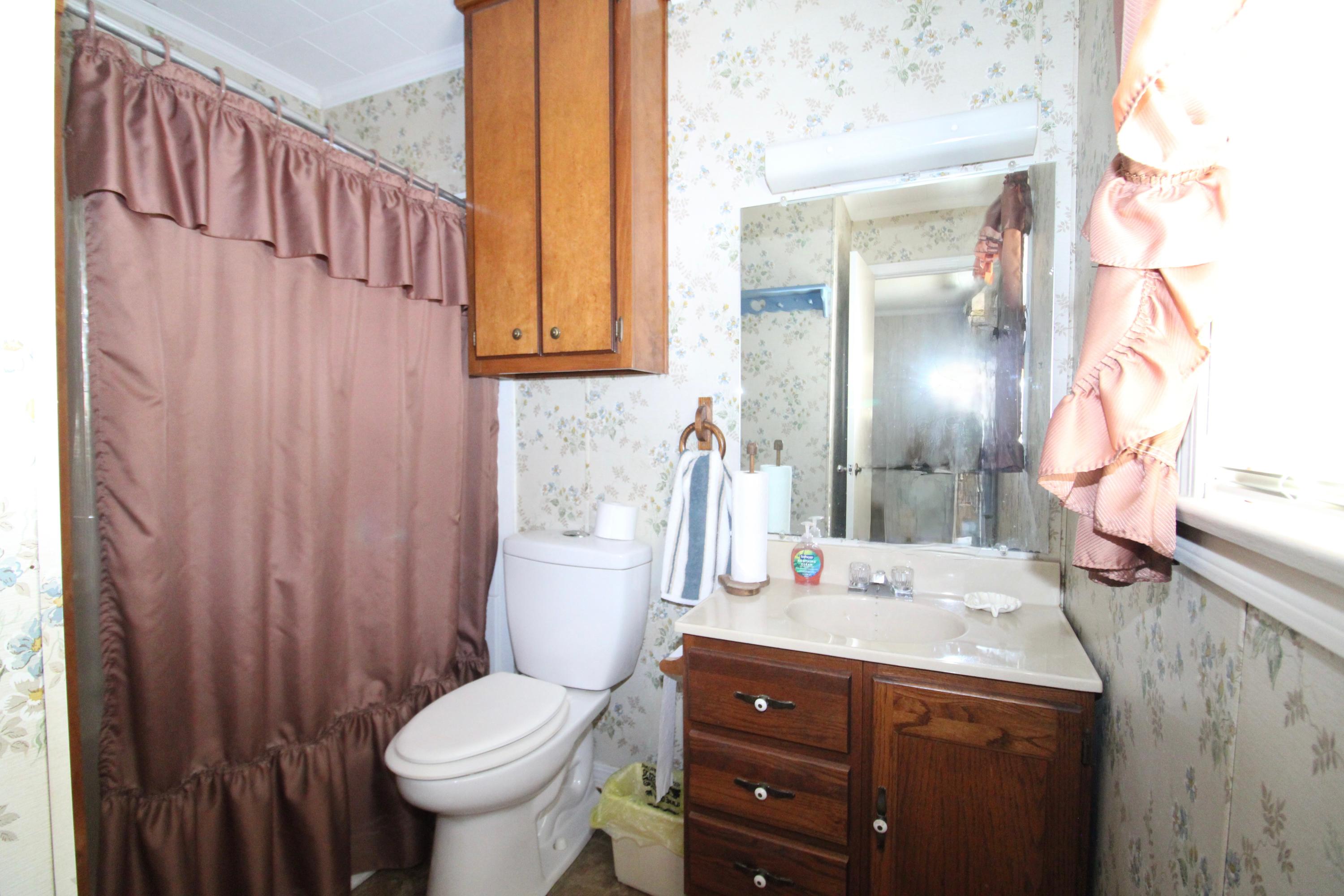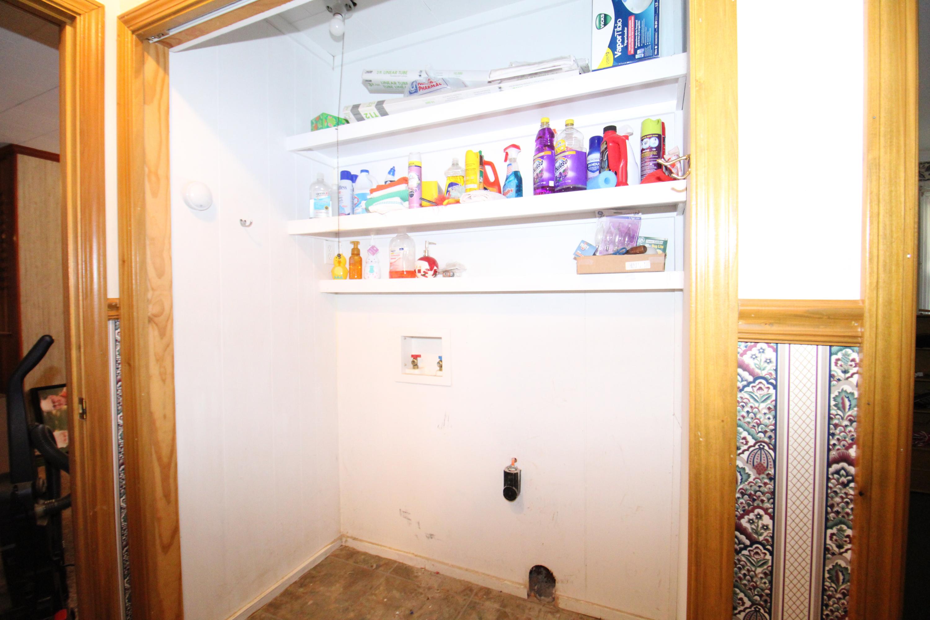 The home offers three bedrooms and two full bathrooms. Washer and dryer hookups are located on one side of the living area, while the primary bedroom and bath are situated across the home for added privacy.