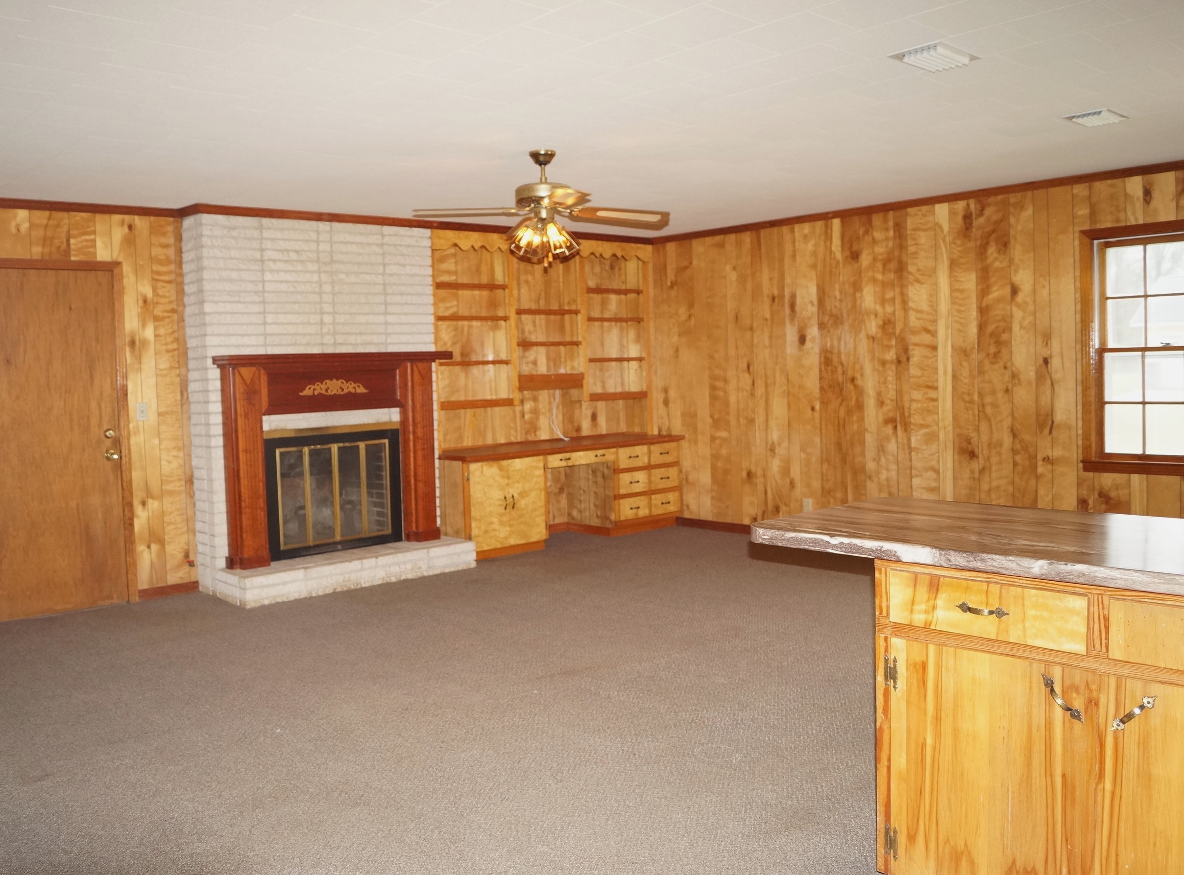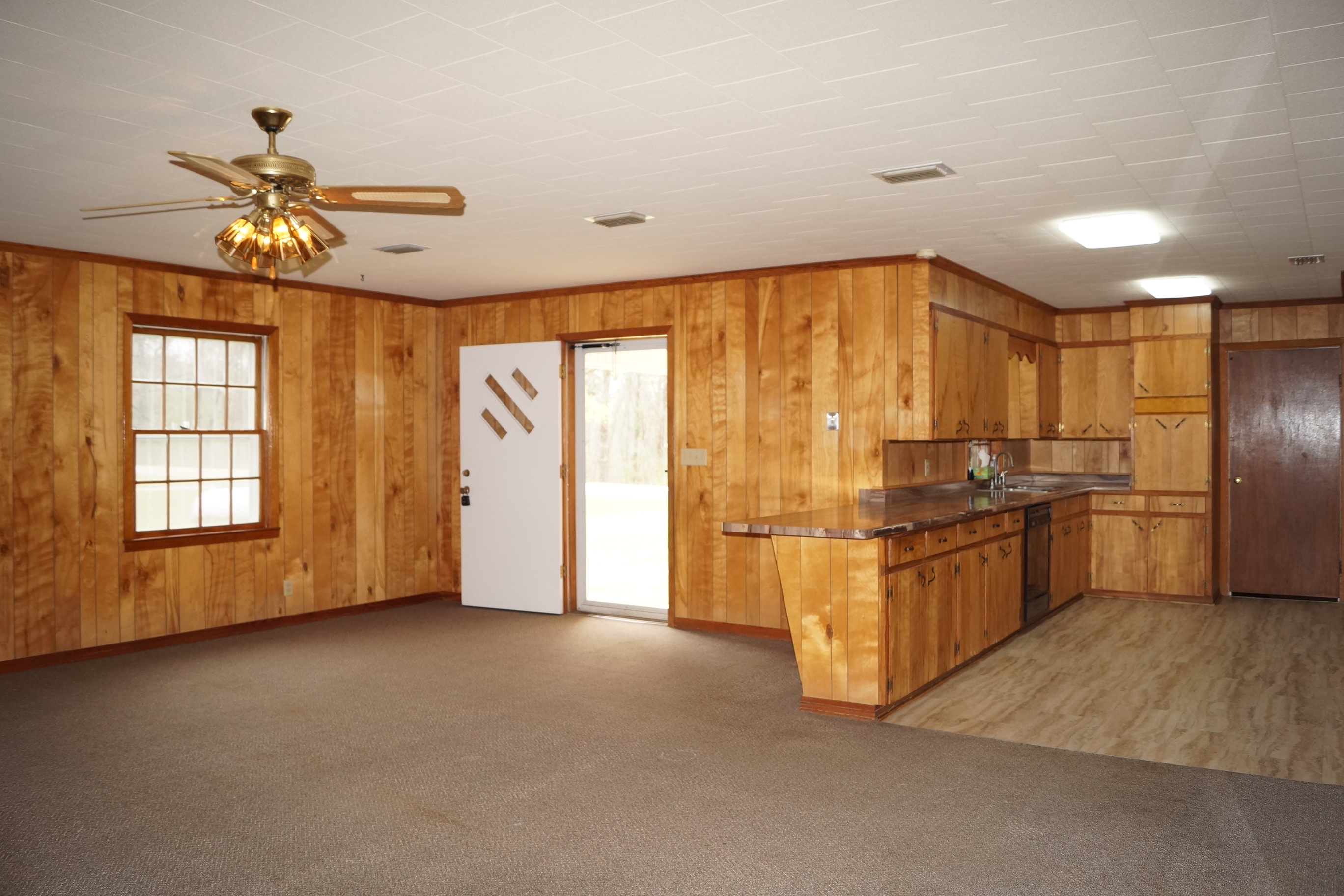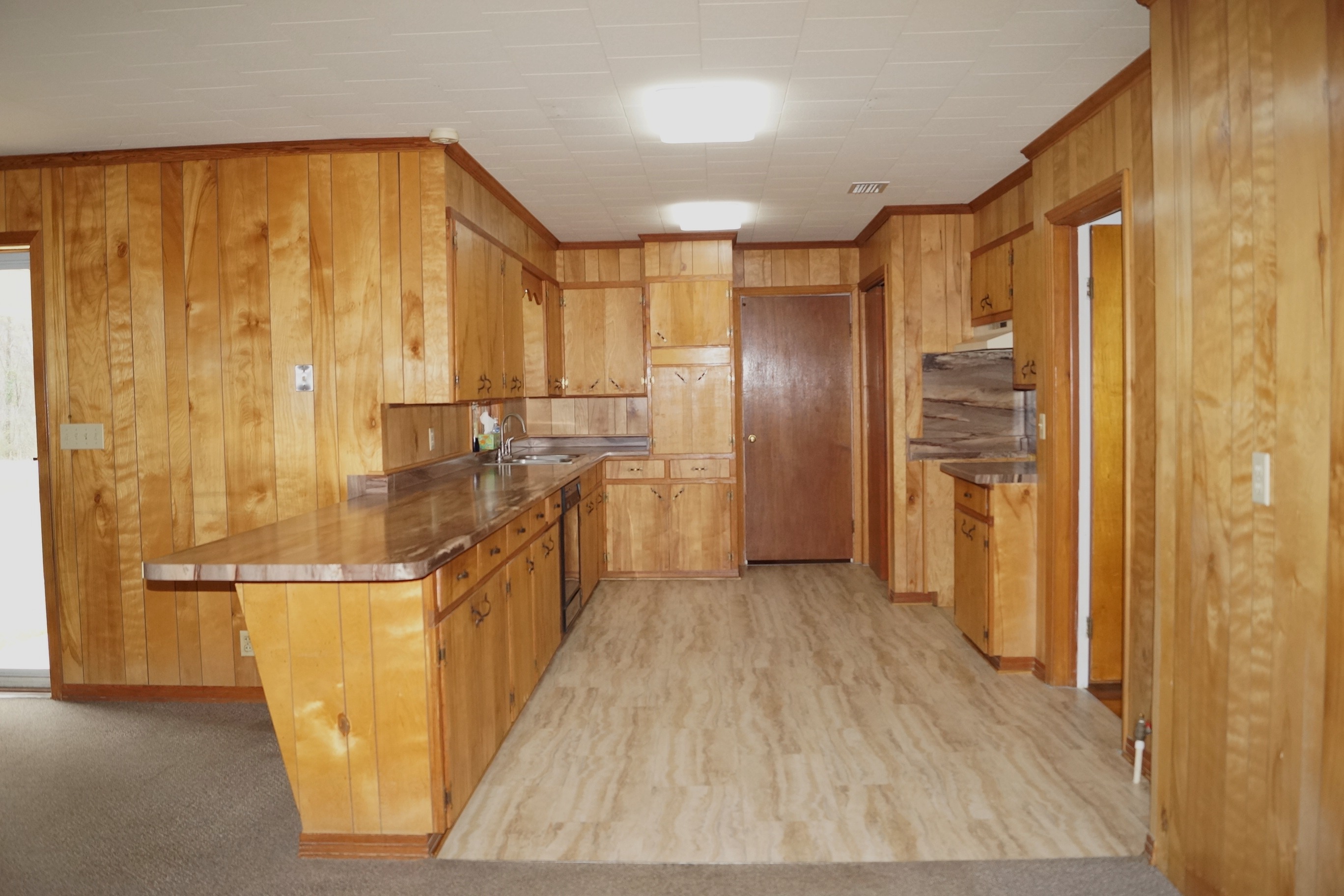The kitchen offers a convenient walk-through layout with plenty of cabinet and countertop space—perfect for cooking and entertaining. The home includes three generously sized bedrooms and a large bathroom with double sinks.
